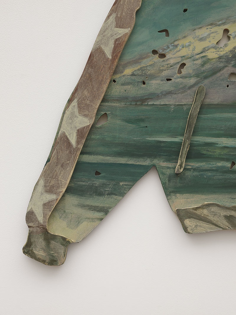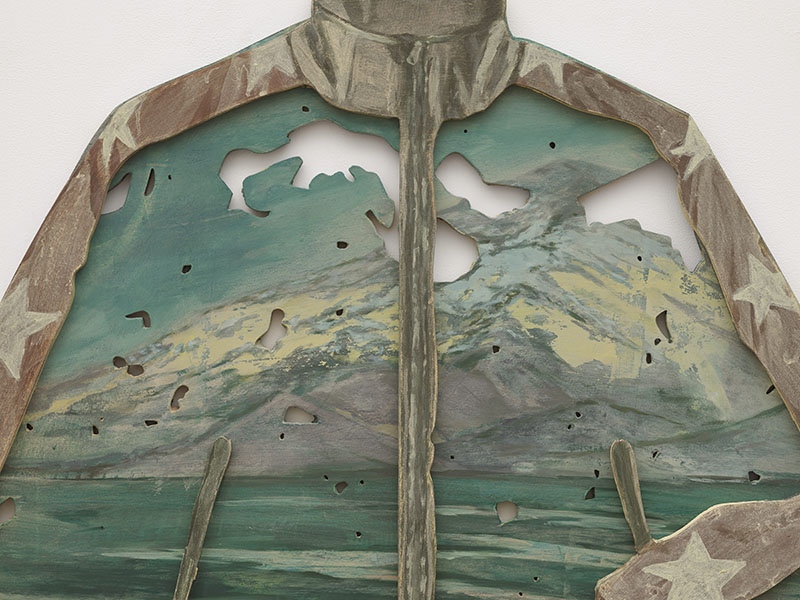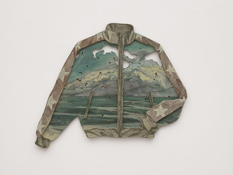 This work is about identity; about how, for instance, clothing can serve as a symbol of status. The sports jacket references urban culture. It is worn in big cities like Lima, Peru, to “fit in”. In the background, we see Peru’s countryside depicted. We see mountains that are characteristic of the Andes region. For Arturo, the tension of the piece lies in this contradiction. In the countryside they dream of the city and the other way around.