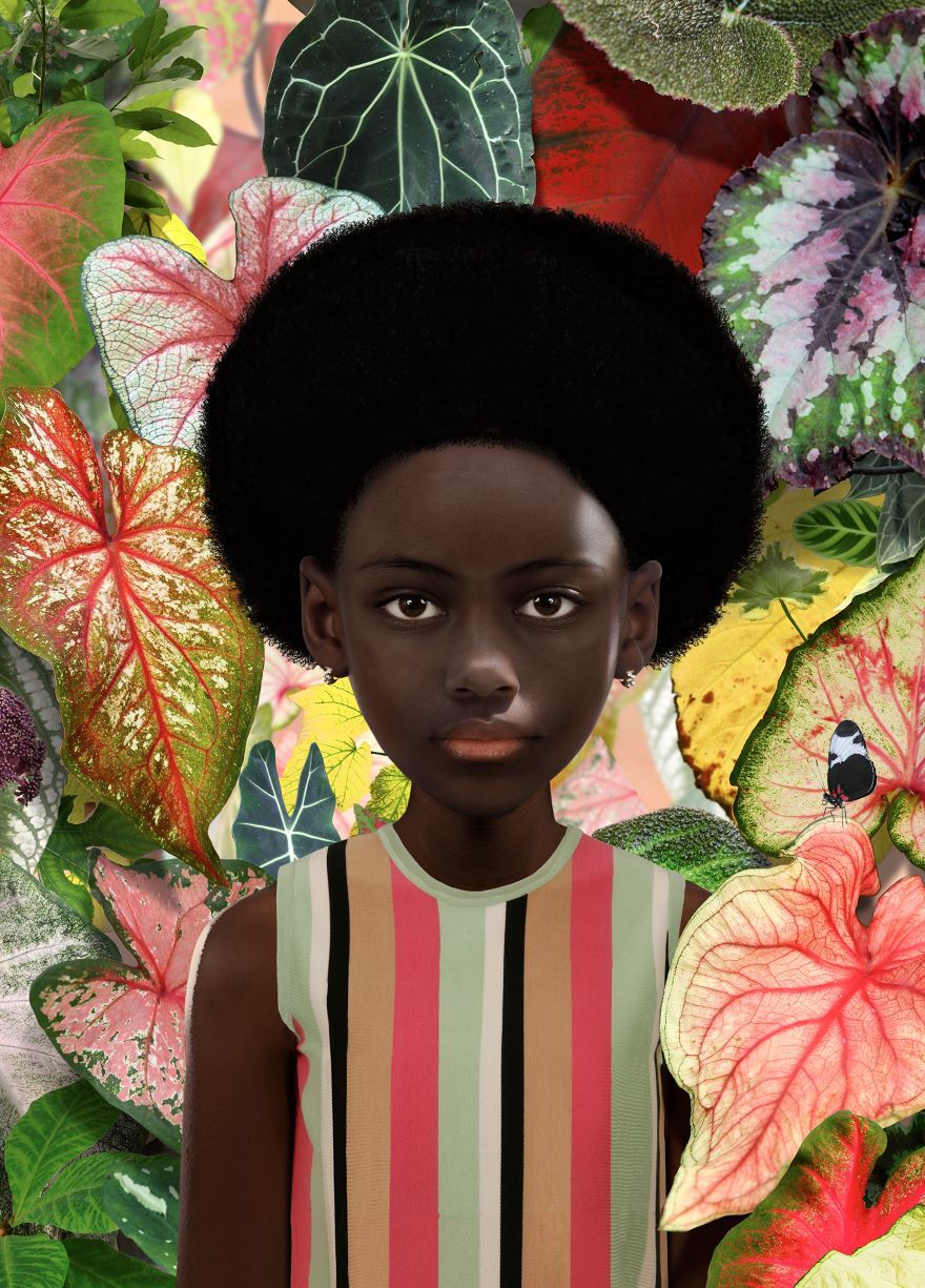 Ruud van Empel’s fantastical, photographic portraits of children in opulent landscapes exude an air of innocence. We see reflected here the rose-coloured appreciation of nature. The surreal quality of his compositions is enhanced by his digital collage technique. Van Empel compiles them from a large stock of photographs. The undulating fields of plants and flowers give the photograph an underlying sense of stitched-together strangeness.